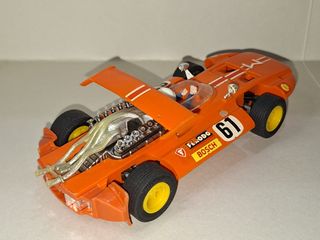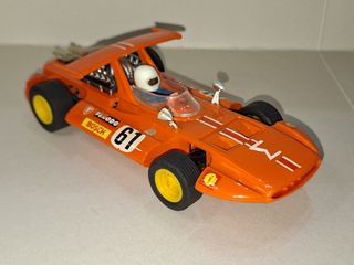 Coche de la marca Scalextric fabricado en España por Triang / EXIN, Sigma F1 en color naranja. Referencia C-47 / 4047 Poco jugado. Sin manchas ni reparaciones. 100% original, incluyendo dorsales nº '61', alerón, espejos retrovisores, motor simulado y escape. Casco blanco. Neumáticos originales en muy buen estado. Trencilla Motor limpio y engrasado, en perfecto estado de funcionamiento, listo para vitrina Intrucciones y caja originales con dos etiquetas y pegatinas color. Las fotografías son la mejor descripción Envío por Wallapop y posibilidad de entrega en mano en zona Oeste de la Comunidad de Madrid Escalextric Colección slot