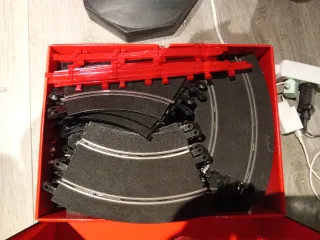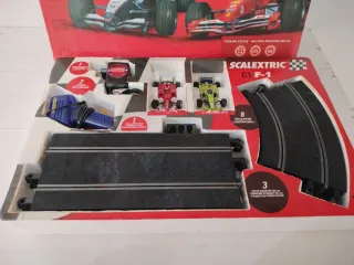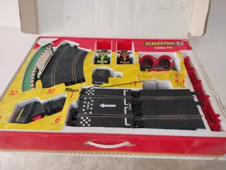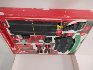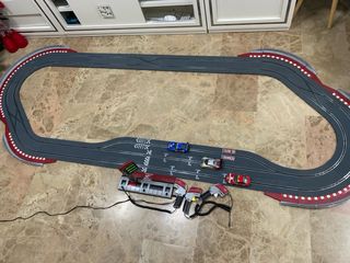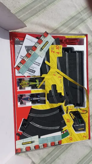 Set de Scalextric con coches y pistas. - Dos coches de carreras. - Varios tramos de pista para montar. - Mandos de control Completamente nuevo solo se ha sacado una vez y ha durado 10 minutos con el jugando