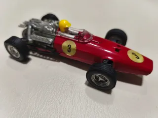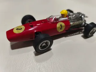 Coche de carreras clásico de Scalextric en color rojo. - Diseño deportivo. - Detalles del motor visibles. - Número 3 en los laterales y frontal.