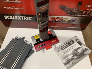 Circuito sistema Scalextrix de Pit Box digital System. Todas las piezas y pistas. Con caja e instrucciones. Los coches necesitan algo de mantenimiento (cambio de escobillas). El Ferrari azul tiene algún problema de comunicaciones (funciona bien en pista, pero al entrar al pit no carga gasolina).