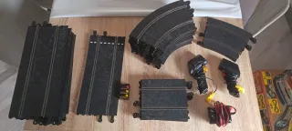 Conjunto de pistas y accesorios para Scalextric. - Variedad de pistas rectas y curvas. - Dos mandos de control. - Conexiones y transformador incluidos.