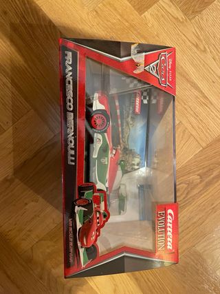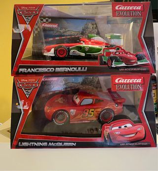 Dos coches de slot de la marca Carrera Evolution, inspirados en la película Cars 2 de Disney Pixar. - Coche 1: Francesco Bernoulli. - Coche 2: Rayo McQueen. - Escala 1:43.