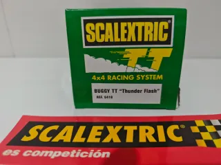 Coche de competición Scalextric TT. Buggy " Thunder Flash" Pequeño desperfecto en la caja Nuevo a estrenar Mas coches en mi perfil - Diseño deportivo en color blanco. - Detalles de patrocinadores y gráficos.