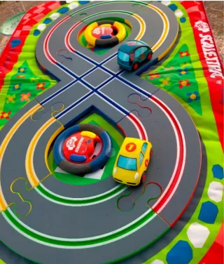 Circuito de carreras Mi Primer Scalextric para los más pequeños. Incluye todo lo necesario para empezar a jugar. - Circuito de pistas. - Dos coches de carreras. - Mandos de control.