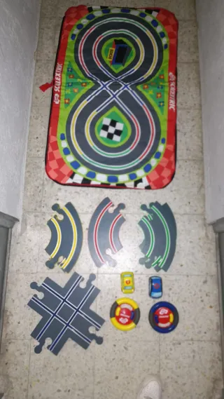 Circuito de carreras Scalextric Compact. - Incluye dos coches de competición. - 2 Mandos de control. - Varios tramos de pista para montar. - Barreras de seguridad rojas. A los coches hay que ponerle las trencillas nuevas. Ver fotos