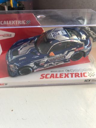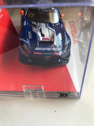 Coche de Scalextric modelo Mercedes AMG GT3. - Diseño deportivo en azul y blanco. - Detalles de patrocinadores como Tarmac Works y Michelin. - Número de dorsal 77.
