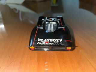 Coche de juguete a escala con diseño deportivo y temática Playboy. Sin caja - Color negro. - Detalle del número 1 en blanco. - Diseño con el logo de Playboy. - Ruedas doradas. - le faltan las dos aletas de atras y el espejo retrovisor