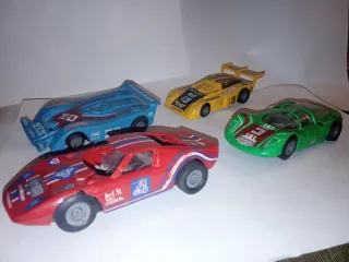Lote de cuatro coches de slot para Scalextric. Incluye un coche rojo con dorsal 4, uno azul con dorsal 20, uno amarillo con dorsal 19 y uno verde con dorsal 3. - Coche rojo con detalles Dunlop y número 4. - Coche azul con detalles Firestone, Ferodo y número 20. - Coche amarillo con detalles Elf y número 19. - Coche verde con detalles Martini Racing Team y número 3.