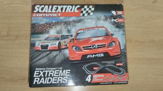 Circuito de slot Scalextric Compact 1:43, modelo Extreme Raiders. Incluye dos coches y pista. La caja está un poco dañada. Tanto las piezas, como los coches y los mandos están en perfecto estado y funcionan a la perfeccion - Mando Turbo. - Puente. - 4 circuitos para competir. - Dimensiones de la pista: 148 x 103 cm. - Recorrido de la pista: 4,5 m. - Manual de pistas