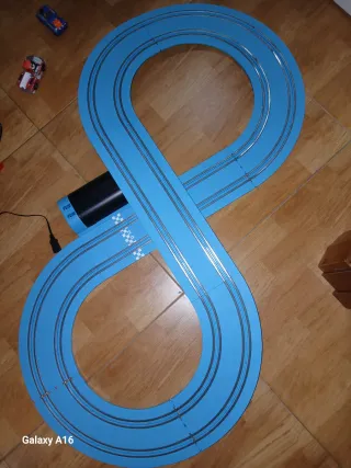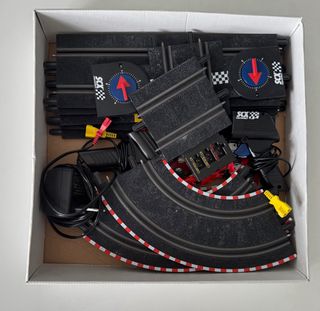 Circuito de coches Scalextric para horas de diversión. - Incluye varias piezas de pista. - Dos coches de carreras. - Mandos de control.
