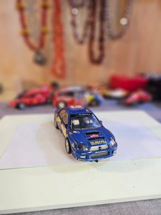Coche de colección Subaru Rally, modelo de competición. - Diseño deportivo azul con detalles amarillos. -falta aleron