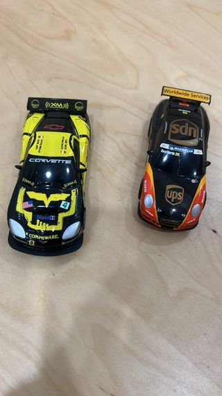 Tres coches de slot Scalextric Compact. - Coche 1: Porsche negro con detalles en naranja y logo de UPS. - Coche 2: Corvette amarillo y negro con logo de Chevrolet y CORVETTE. -coche 3 3 CITROEN Rally