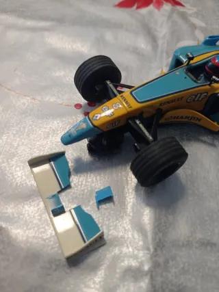Coche de Scalextric Hornby de Fórmula 1. Alerón delantero roto están las piezas para reparar - Diseño RENAULT. - Colores azul y amarillo. - Incluye alerón delantero desmontado.