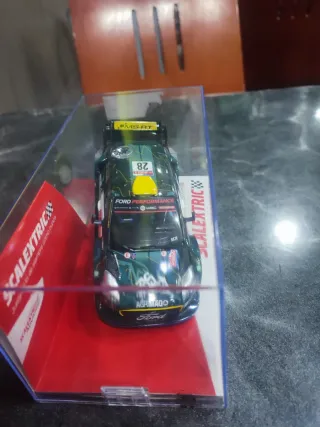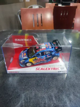 Coche de slot Scalextric Ford, modelo de rally. - Diseño inspirado en el Rally Monte Carlo. - Detalles de patrocinadores como Ford, Valvoline y Telefonica. - Incluye figura de piloto en el interior.
