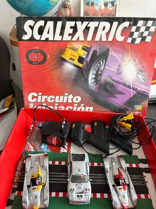 Circuito de carreras Scalextric para horas de diversión. Incluye todo lo necesario para empezar a jugar. Alguna pieza de la pista le falta uni de los dos clics pero no pasa nada - Pista con curvas, rectas y puente. - - Dos mandos de control. Solo hoy Envio preferiblemente por inpost