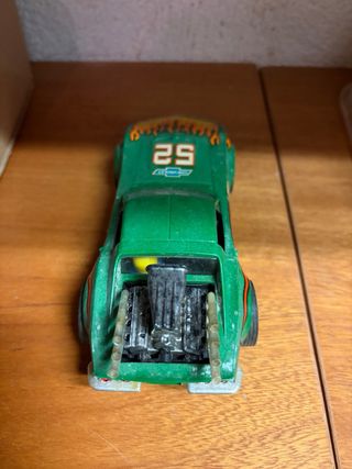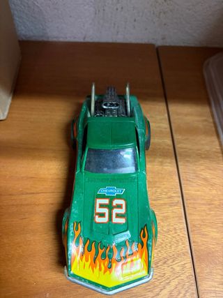 Coche de Scalextric Chevrolet Corvette en color verde. -Esta sucio pero es como nuevo. Diria que ha corrido poco o nunca. - Diseño deportivo con llamas. - Número 52 en el capó. - Logo de Chevrolet.