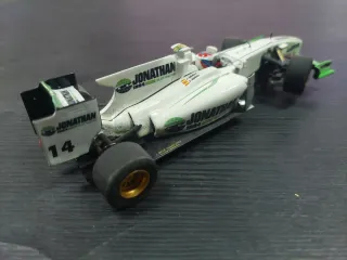 Réplica de coche de Fórmula 1 de Scalextric con personalización. - Diseño blanco con detalles verdes. - Inscripción JONATHAN en varios puntos. - Número 14 en el alerón trasero. - Piloto con casco de colores en el cockpit.