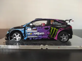 Coche de Scalextric Hyundai I20 WRC Ken Block. - Chasis 3DSRP. - Guia SRC. - Llantas Sloting Plus América 16.5 - Cojinetes Victors - Motor Speed 7 con cable naranja SP. - Poleas aluminio Sloting Plus. - Ejes Sloting Plus. - Correa SRC. - Cockpit 3DSRP decorado. Usado pero en muy buenas condiciones, coche muy rápido.
