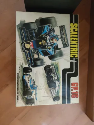 Caja de Scalextric GP.16 con ilustraciones de coches de carreras. - Ilustración de un coche Lotus John Player Special. - Ilustración de un coche Elf. - Ilustración de un coche Leyland. - Texto INTERNATIONAL MODEL MOTOR RACING.