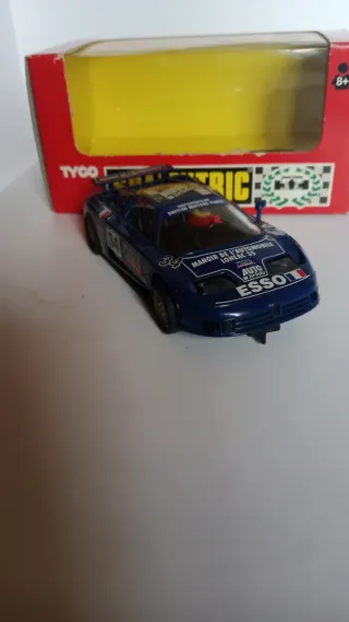 Coche de Scalextric Bugatti EB 110, modelo de Le Mans. Muy poco uso. Siempre en vitrina. Con su caja. Falta retrovisor dch. La carrocería un poco deformada. - Réplica detallada del Bugatti EB 110. - Diseño inspirado en las carreras de Le Mans. - Color azul con patrocinadores. - Incluye piloto en el interior.