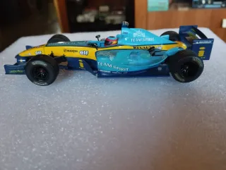Réplica del coche de Fórmula 1 Renault R24 de Scalextric. De Fernando Alonso habría que hacerle revisión de escobillas - Diseño detallado del monoplaza. - Colores azul y amarillo característicos. - Escala 1:32.