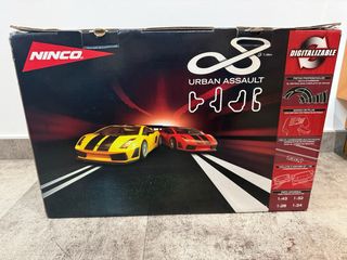 Circuito de slot Ninco Urban Assault, listo para la diversión. Incluye dos coches Lamborghini Gallardo. 5 circuitos alternativos. - Pistas profesionales. - Mando SS Plus con sistema de freno eléctrico. - Recta de conexiones multifunción. Incluye todo. Usado muy poco.