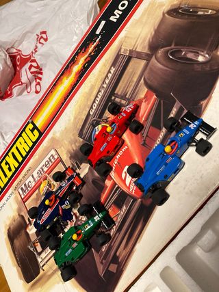 Circuito de Scalextric Monza con coches y accesorios. - Incluye 4 coches de competición: un McLaren y 3 ferrari - Varias pistas de circuito para montar. - Dos mandos de control. - Transformador de corriente.