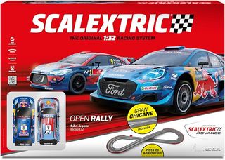 Circuito de Scalextric Open Rally con 5.2 metros de pista. Incluye coches y accesorios para empezar a correr. - Escala 1:32. - Incluye Gran Chicane y Pista de Adaptación. - Dos coches de rally detallados.