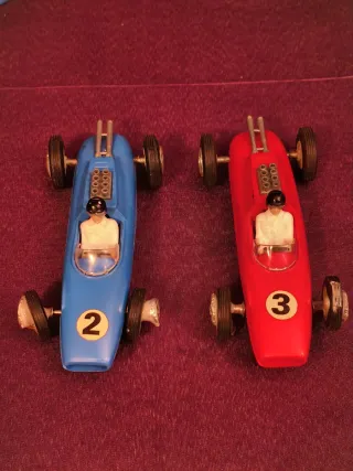 Set de coches y mandos de Fórmula 1 de Jyecar. Años 70. - Dos coches de carreras, uno azul con el número 2 y otro rojo con el número 3. - Dos unidades de control con volante, uno azul y otro rojo. Las fotos forman parte del estado y de la descripción. Observad el plástico de las ruedas delanteras, especialmente. No están probados.