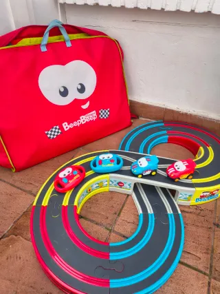 Scalextric infantil. Pilas no incluidas. Los he probado y los coches van muy lentos... Así que igual necesita algún ajuste.