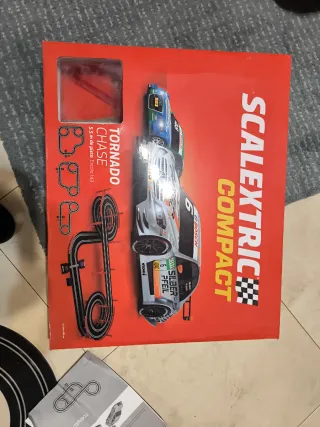 Circuito de slot Scalextric Compact, modelo Tornado Chase. Incluye coches y pistas para montar un recorrido. - Escala 1:43. - Longitud de pista: 5,5 metros. Uno de los coche no va, el otro va lento no se porque ya que lo hemos usado solo una vez, como mucho dos. A mí hijo no le gustan los coche , ha sido un regalo Se puede ver las pistas o los coches que no tienen desgaste ninguno, no se si por el tiempo que ha estado guardado no funcionan bien