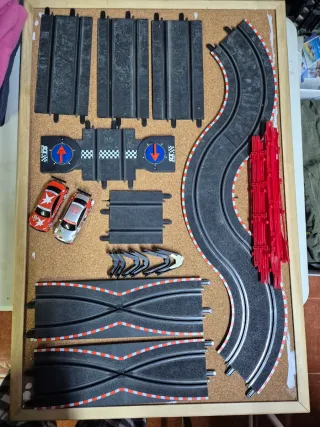 Circuito de Scalextric Compact en escala 1:43. Ideal para carreras. Todas las pistas tienen una o varias pestañas rotas, no afecta a montaje ni funcionamiento - Incluye varias curvas y rectas. - Compatible con coches de la misma escala.