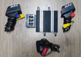 Accesorios para pista de Scalextric Compact. Incluye pista de conexión, mandos analógicos con cable, transformador de corriente y pista cuentavueltas. - Dos mandos de control SCX. - Un tramo de pistas de conexión. - Un transformador de corriente.