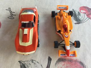 Dos coches de juguete, uno de estilo deportivo y otro de carreras. - Coche deportivo naranja con detalles en amarillo. - Coche de carreras naranja y amarillo con piloto rojo. - Marca: Scalextric. proyecto para terninar solo carroceria y chasis precio por los dos scalextric exin ninco fly