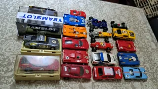 Lote de coches de slot Scalextric Exin Triang. Precio según modelo y estado. - Coches de diferentes modelos y colores. - Incluye coches como el Ford Escort MKH RS2000 y otros modelos de competición. - Algunos coches vienen en sus cajas originales.