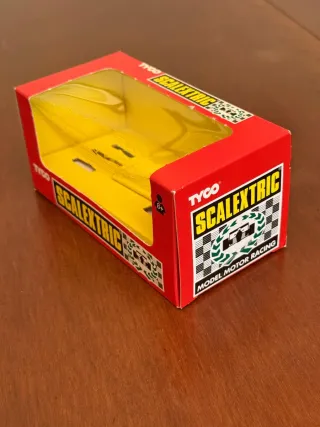Caja vacía original para el modelo Scalextric Porsche 911 (1996) de Le Mans. - Diseño frontal con ventana transparente. - Colores rojo y amarillo. - Incluye logo de Tyco y Scalextric.