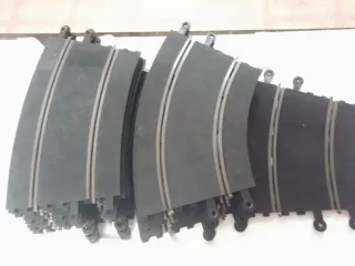 Conjunto de 46 curvas para pistas de Scalextric. Ideales para ampliar o crear nuevos circuitos. - 46 piezas de curvas. - Color negro con detalles plateados.