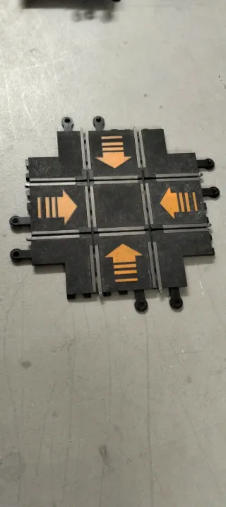 Pieza de cruce para pistas de Scalextric. Permite crear configuraciones de circuito más complejas. - Diseño en forma de cruz. - Flechas indicadoras de dirección en color naranja.