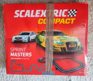 Circuito de slot Scalextric Compact Sprint Masters. Incluye 3,6 m de pista y coches a escala 1:43. - Diseño de pista configurable. - Coches de carreras detallados. Solo está el Mercedes y falta una de las piezas que narco con un circulo