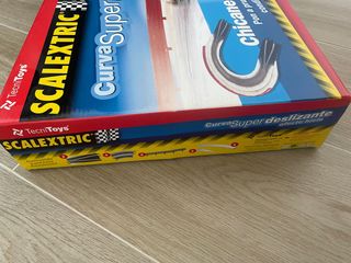 Cuatro curvas chicane de Scalextric. • Los dos carriles se unen. • 3 piezas con brillo y bandas. • Zona ideal para competir porque pasa un coche detras de otro.