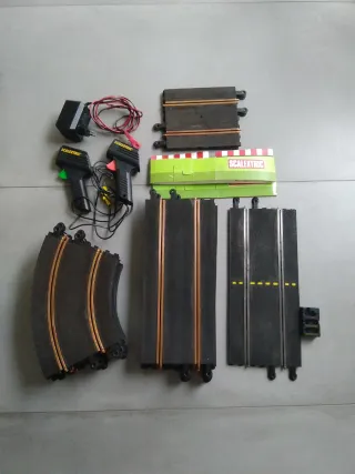 Set de Scalextric con pistas y mandos. - Incluye transformador. - Dos mandos de control. - Varias pistas de circuito. - 10 curvas - 2 rectas cortas -6 rectas largas