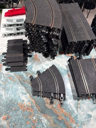 Circuito de Scalextric con varias piezas. - Incluye tramos de pista y accesorios. - Ideal para ampliar circuitos existentes.