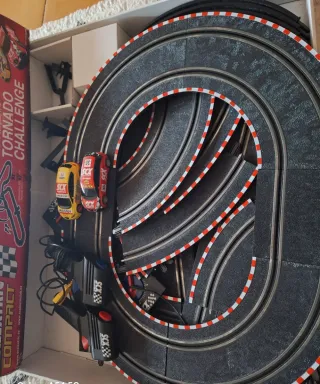 Circuito de slot Scalextric Tornado Challenge Compact en escala 1:43. Incluye 4 circuitos para ganar. Uno de los mandos no funciona. Resto en perfecto estado - Pista con looping. - Mando turbo. - Puente. - Cuenta vueltas.