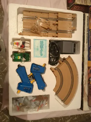 Conjunto de piezas y accesorios para Scalextric. - Variedad de pistas curvas y rectas. - Dos mandos de control. - Transformador de corriente. - Barreras de pista.