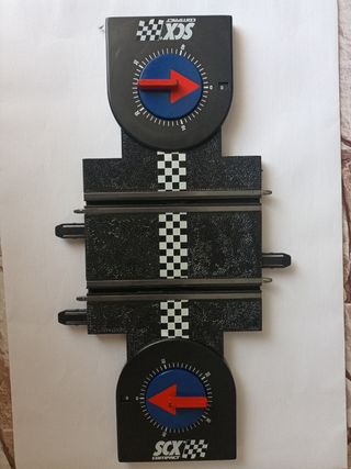 Set de Scalextric con transformador y mandos. - Incluye transformador de corriente. - Dos mandos de control. - Tramos de pista con señalización de salida y meta.
