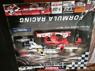 Vendo circuito Scalextric de coches Carrera Formula 1 Evolution. Faltan algunos accesorios y alguna piezas presentan desgastes pero funciona todo correctamente y las pistas están todas y en buen estado. - Incluye 2 coches de Fórmula 1: Ferrari F2005 y Williams F1 Team. - 8 curvas,5 rectas y pista de salida.