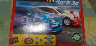 Circuito de carreras Scalextric Copa Junior en perfecto estado. Incluye dos coches, uno Seat León y otro Hyundai Copa, listos para la competición. - Circuito de 2,46 metros. - Transformador electrónico. - Escala 1:32. Escucho ofertas serias. Entrega en Alcorcón central.