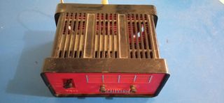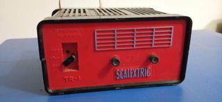 Transformador y rectificador Scalextric TR-1 con dos mandos. - Voltaje seleccionable 125V / 220V. - Salida 12V = 1.5 Amp. - Diseño en color rojo con rejilla superior.