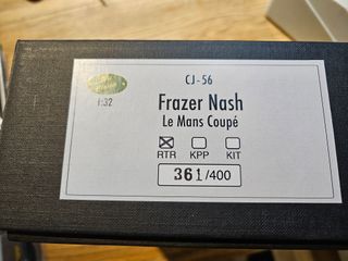Vendo el coche de scalextric Frazer Nash Le Mans Coupé fabricado por Slot Classic en escala 1/32 con Ref CJ-56 en versión RTR (Ready to Race). Edición limitada con número de unidad: 361 de 400. Envío por Wallapop o recoger en mano en Madrid. (JMS0143-M32099)
