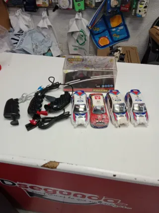 Conjunto de coches Scalextric y accesorios. - Incluye 4 carcasas de coche de competición. - Se aprecian mandos y cables. - Caja original de Scalextric.